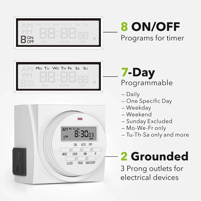 - Versatile Programming: Easily set up to 8 on/off programs for the timer's two grounded outlets, with settings as short as one minute.
